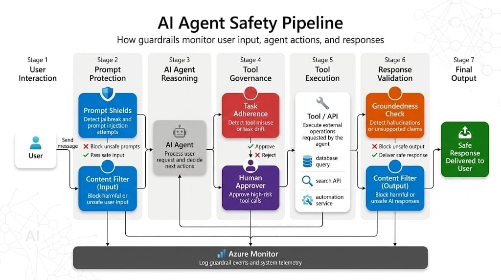 No single safeguard is sufficient on its own. Prompt filters miss things. Moderation models have edge cases. Policy checks can be bypassed if they are applied too late in the process. The only reliable approach is layered control, where multiple safeguards operate at different stages of the agent workflow.