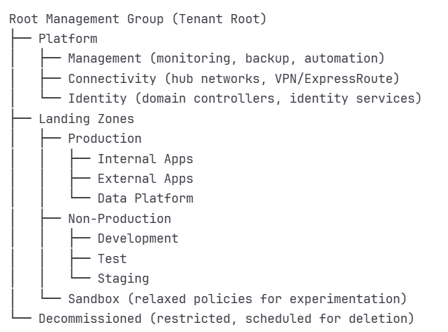 Pro tip: Always treat the “Root Management Group” as your control plane. That’s where your compliance, region restrictions, and baseline guardrails belong.